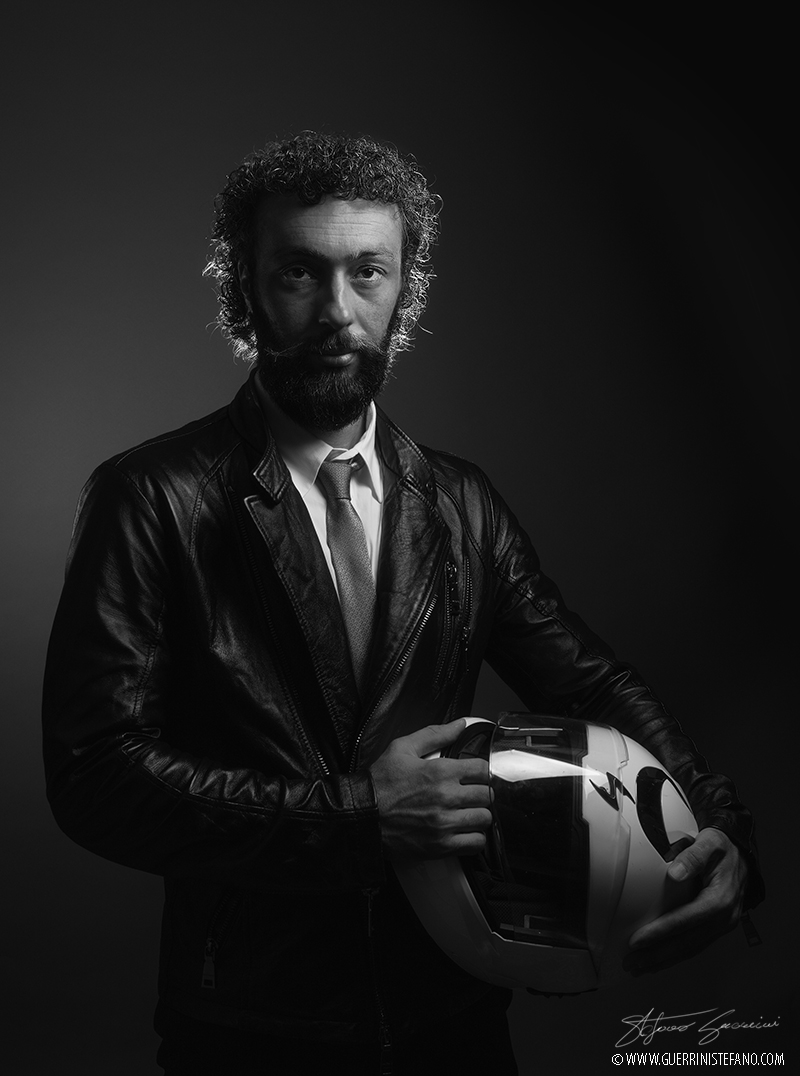 I used 4 speedlite flashes. The first was in a softbox of 60×60 cm in rembrandt position to the right of the image. The second, to brighten the background, to the left, diagonally. The third behind the subject as a rim light pointed at his hair. The fourth placed frontally on left to slightly lighten the shaded part of the subject.