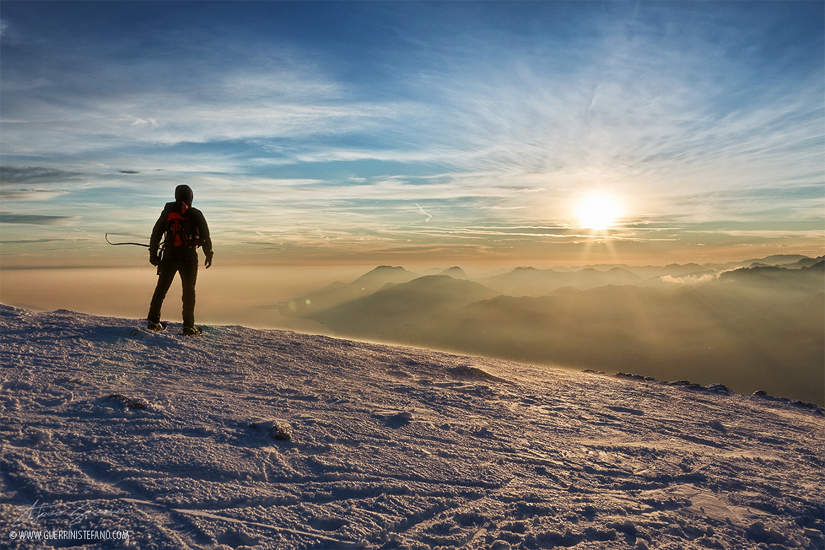 Last February 2015 I was on the Damiano Chiesa refuge on the peak of Altissimo mountain near Brentonico in Trentino region, north Italy, to photograph sunset and sunrise at 2074 meters of altitude! It’s a really beautiful place because you can look from there all the Garda lake! It’s absolutely fantastic during sunset and sunrise and also during the night! There was a pretty strong wind! In this image I like the strip of my backpack that was in the wind. It add a dinamic effect at the image!!