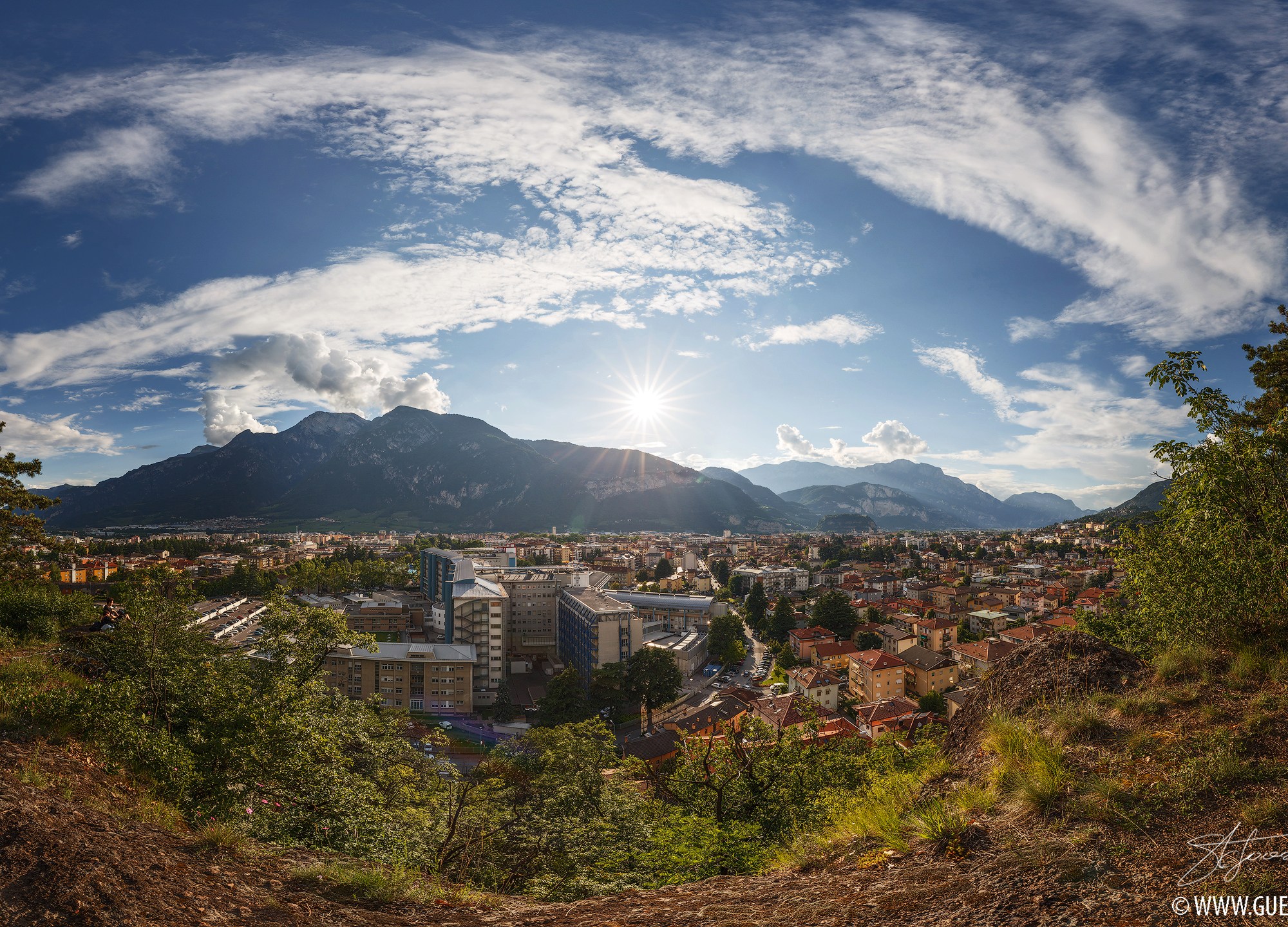 Da parco Gocciadoro si gode di una vista su buona parte della città di Trento. Si possono distinguere: ferrovia della Valsugana (con treno in transito nella foto), campanile della chiesa di S PioX, nuovo quartiere delle Albere di Renzo Piano, ciminiere dell’ex Italcementi, Doss Trento, Duomo e Torre Civica con bandiera di Trento, Torre Verde, Castello del Buonconsiglio. In primo piano l’ospedale S.Chiara che verrà sostituito dal progetto del nuovo ospedale NOT a Trento sud.