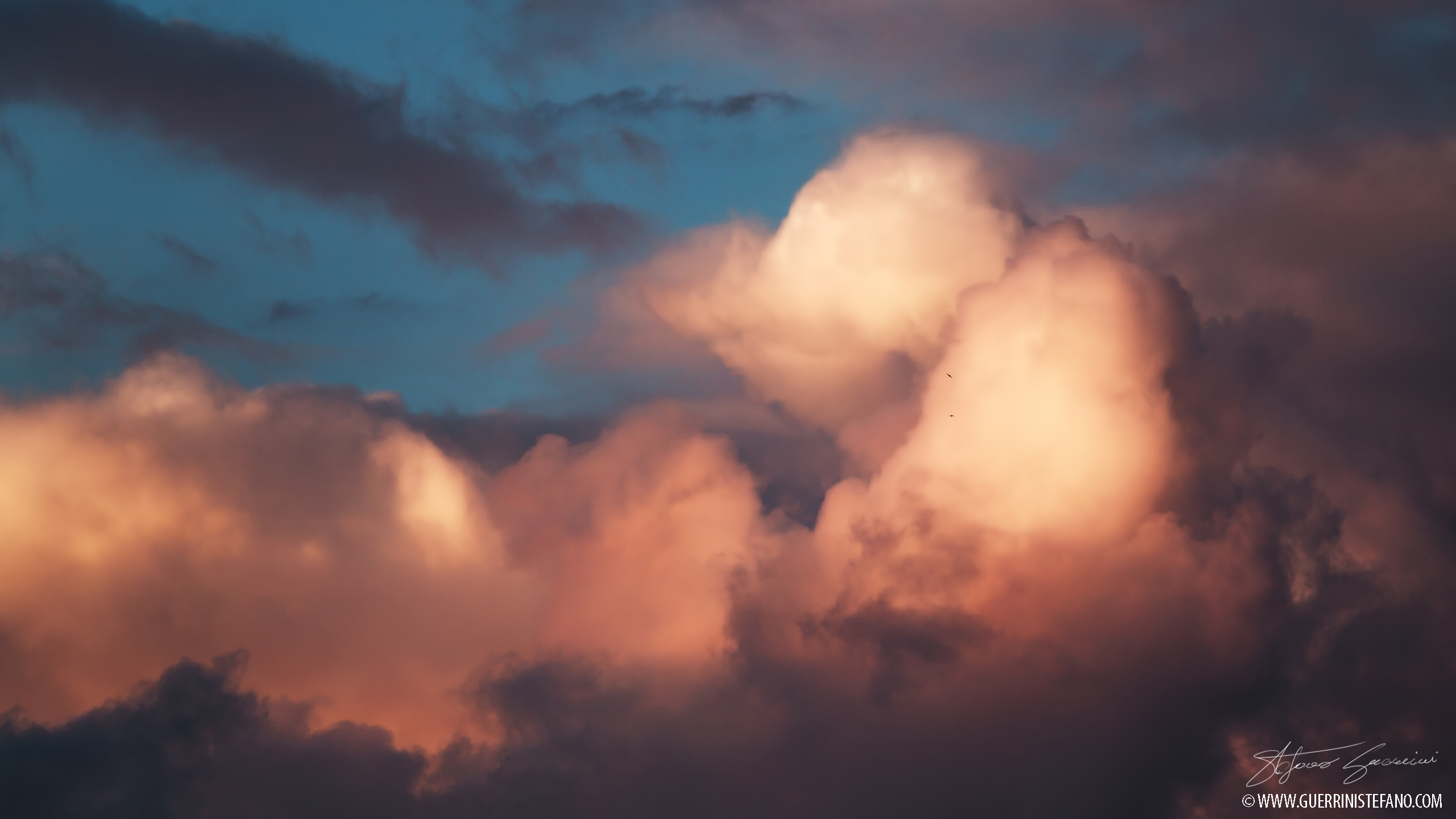 L’utilizzo di un’ottica da 300mm schiaccia i piani ed inganna l’occhio di chi guarda l’immagine. Le nuvole appaiono molto più grandi di quello che siano in realtà.