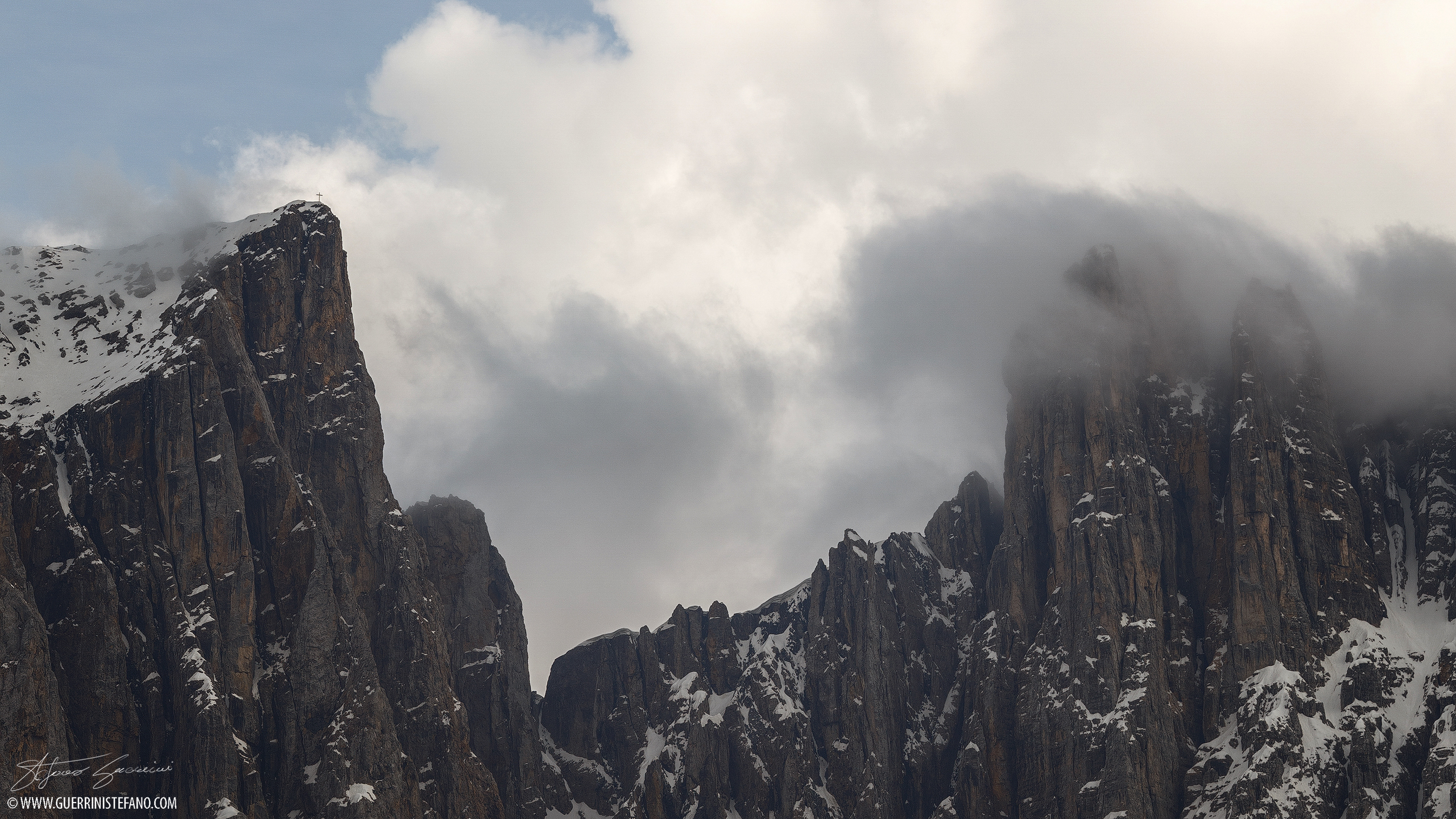 Vista della croce di cima Schenon (2800m) del Latemar, Alto Adige, fra la nebbia, la neve e i colori della roccia. Più a destra la forcella grande del Latemar e la torre Cristomannos avvolta dalle nubi.