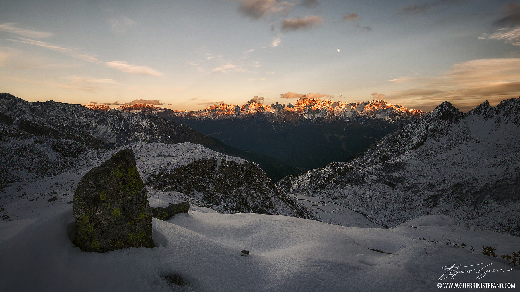 Nell’immagine qui sopra ho scattato utilizzando un treppiede ed una lente grandangolare. La posizione della macchina fotografica era vicina al terreno. Uno dei problemi in questi casi è riuscire ad avere tutto perfettamente a fuoco cercando allo stesso tempo di avere un soggetto in primo piano molto vicino (piccola roccia sulla sinistra) e uno sullo sfondo (Brenta con la Luna sulla destra) molto lontano. Luce e composizione devono cercare di catturare l’occhio di chi osserva la foto e guidarlo verso il soggetto principale.