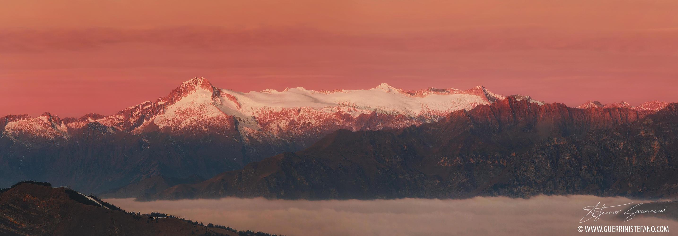 Suggerimenti fotografici: fate bene i vostri calcoli sui tempi di percorrenza in macchina e a piedi per arrivare a questa cima. Molto meglio arrivare circa 1 ora/45 minuti prima dell’ora del sorgere del sole. Se sarete fortunati troverete le nuvole basse che copriranno tutte le valli sottostanti e vi sembrerà di essere sopra un mare che si colorerà man mano che il sole inizierà a sorgere! Prima di arrivare a Cima Sud vi consiglio una breve tappa di ristoro al bivacco Bailoni, dove potrete anche cambiarvi prima di arrivare ai 1736 metri di quota della cima che nella maggior parte dei casi è molto ventosa e dove starete per la vostra sessione fotografica. L’immagine qui sopra è stata scattata pochi minuti prima che il sole spuntasse alle mie spalle ed è l’unione di più immagini scattate con macchina su cavalletto (obbligatorio). Non ho avuto problemi di errori di parallasse visto l’utilizzo di una focale molto lunga e assenza di soggetti vicini a me nell’inquadratura. Dovrete essere molto veloci se vorrete fare delle panoramiche perché la luce cambia molto velocemente!