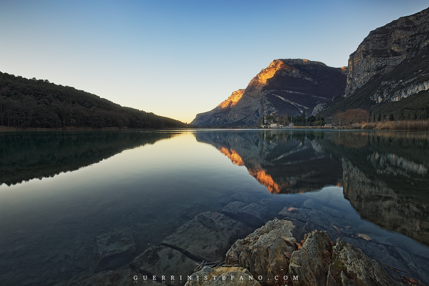 Dove siamo: lago di Toblino in Trentino, sulla strada che da Trento scende verso il paese Sarche. Buona parte del lago, in particolare la sponda occidentale, è contornata da una passerella in legno che permette di spostarsi a bordo d’acqua per ammirare questo bel posto. Sulla destra di questa immagine si vede, riflesso nell’acqua, Castel Toblino e la vegetazione che lo circonda. Sempre sulla destra la parete verticale del Piccolo Dain dove si trova una delle ferrate piĂą famose e difficili della regione, la ferrata Rino Pisetta. Subito dietro il castello, illuminato dai primi raggi di sole, il monte Casale e il monte Brento piĂą in lontananza.