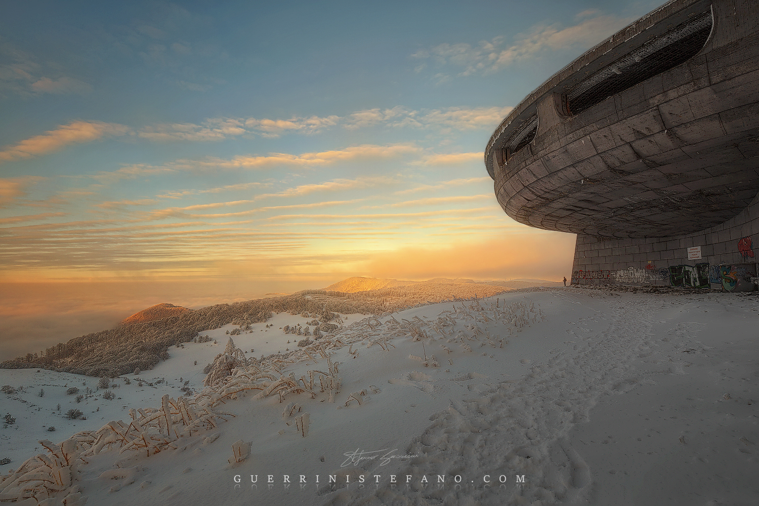 Durante la creazione di un time lapse a Buzludzha ho avuto la fortuna di scattare qualche immagine in presenza di una persona che, ignara di essere elemento chiave della mia inquadratura, si è fermata a guardare il tramonto da uno dei punti panoramici che circondano questo monumento.