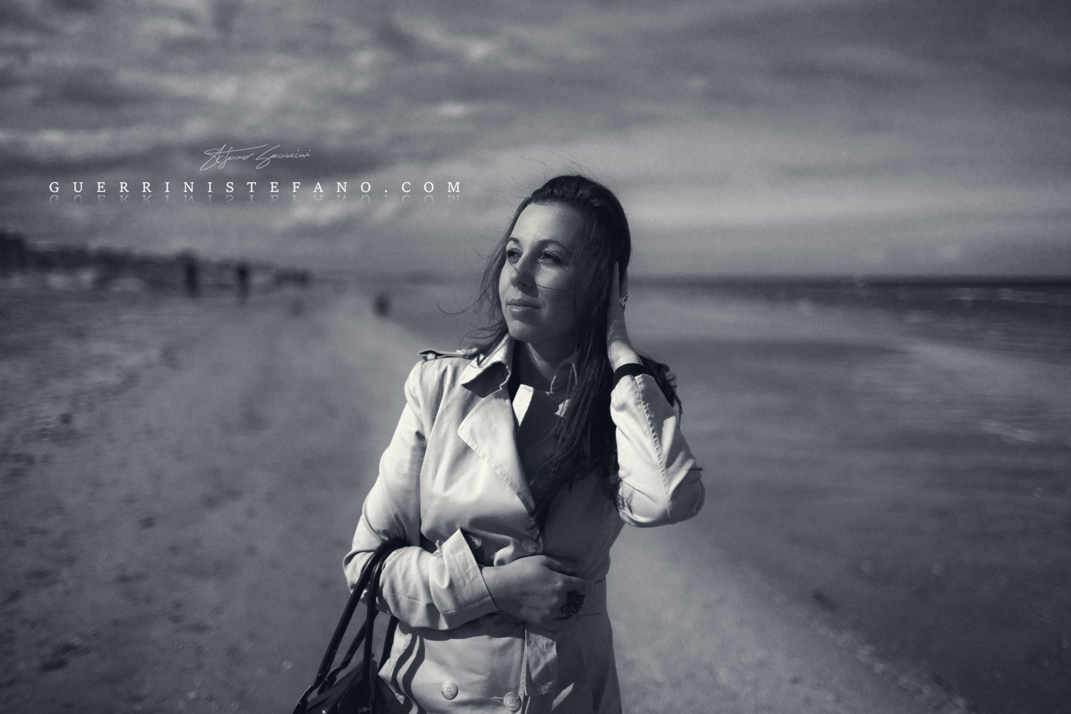 Ritratto in bianco e nero in riva al mare.