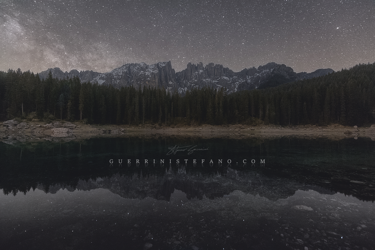 Ho scattato quest’immagine durante una sessione notturna al lago di Carezza senza utilizzare un astro inseguitore e utilizzando un’ottica f/4! Le difficoltà e le limitazioni di questo approccio alla fotografia notturna sono del tutto evidenti. Lo sarebbero maggiormente osservando questo scatto nella versione in alta definizione!