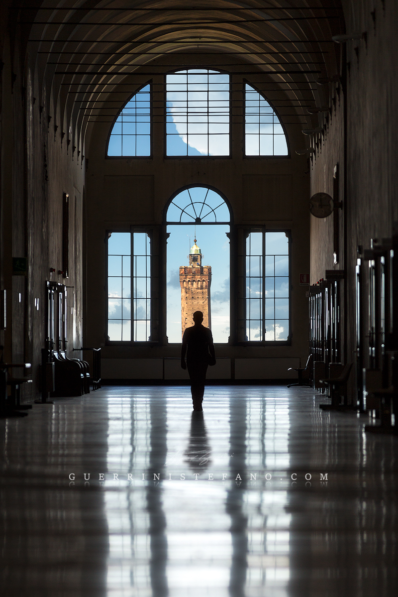 Bologna, ospedale Rizzoli, un corridoio lungo 162 metri con una finestra che punta a nord proprio in direzione della torre degli Asinelli: è il cannocchiale di Bologna! Da qui il centro della città dista circa 1 chilometro e mezzo, ma sembra di poter toccare con mano la torre più famosa della città!