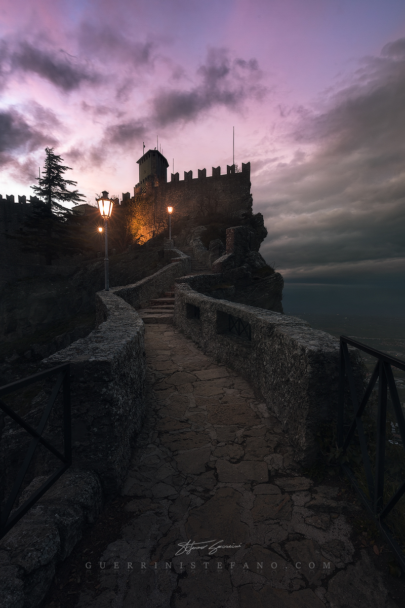 Da sempre questa scalinata che porta ad una delle Torri di San Marino mi affascina. Il suo percorso, fatto di pietre alla vista molto rugose e grezze, si erge verso l’alto a zig zag in maniera del tutto pittorica. Dopo aver sperato tutta la sera che la brutta giornata di pioggia mi portasse qualche sprazzo di luce, il cielo si è aperto poco dopo il tramonto e mi ha regalato un tenue colore violaceo molto particolare e difficile da fotografare!