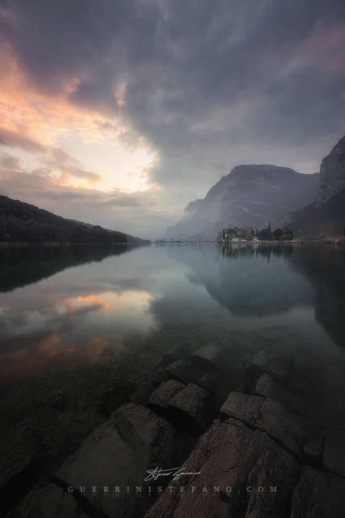 Dove siamo: lago di Toblino in Trentino, sulla strada che da Trento scende verso il paese Sarche. La sponda occidentale del lago è contornata da una passerella in legno che permette di spostarsi a bordo d’acqua per ammirare questo bel posto. Sulla destra, riflesso nell’acqua, Castel Toblino e la vegetazione che lo circonda. Sempre sulla destra si intravede la parete verticale del Piccolo Dain dove si trova una delle ferrate più famose e difficili della regione, la ferrata Rino Pisetta. Subito dietro il castello si trova il monte Casale e il monte Brento più in lontananza, posti mitici per chi si cimenta con gli sport più estremi nella nostra regione!
