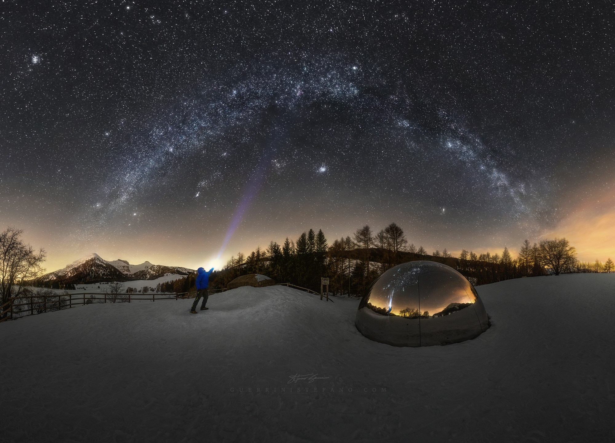 Dove: Terrazza delle Stelle, Viote, Monte Bondone, Trento. Uno dei luoghi più famosi a Trento per osservare le stelle. Il posto scelto è molto meglio di quanto si possa immaginare, visto che siamo pur sempre vicini ad uno dei più grandi centri urbani della regione. La direzione d’osservazione infatti non è turbata dall’inquinamento luminoso proveniente dalla città di Trento, che si trova in posizione opposta rispetto alla direzione d’osservazione. Il riverbero delle luci della città è ben visibile nel riflesso della cupola sferica.
