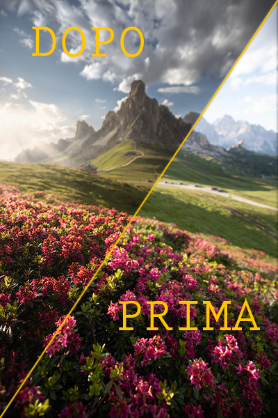 Un’inquadratura come questa, con montagna in lontananza e rododendri in basso, è perfetta per sfruttare questo tipo di distorsione. Il Nuvolau assume una bella forma allungata (ma non eccessiva) che restituisce a questa splendida montagna una forma triangolare slanciata verso l’alto, mentre i fiori in basso non appaiono troppo piccoli e quindi riempiono bene il fotogramma.