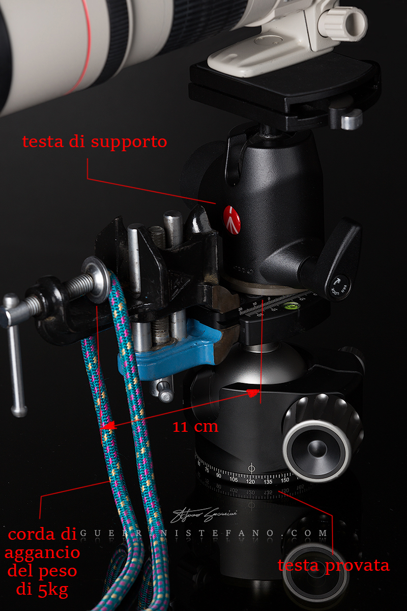 Per minimizzare gli errori di misura, si deve fare in modo che il peso vada a gravare solamente sulla testa provata e non su un eventuale supporto su cui è montata la macchina fotografica. Questo perché altrimenti la flessione dello stesso supporto andrebbe ad influire sulla misura della flessione della testa. Ecco quindi che si è pensato di utilizzare una morsa in ferro fissata direttamente sulla piastra superiore della testa provata (che normalmente è fissata sotto la macchina fotografica). Sopra tale piastra, per misurarne il movimento, si è avvitata una testa “di supporto” alla quale è agganciata la macchina fotografica.