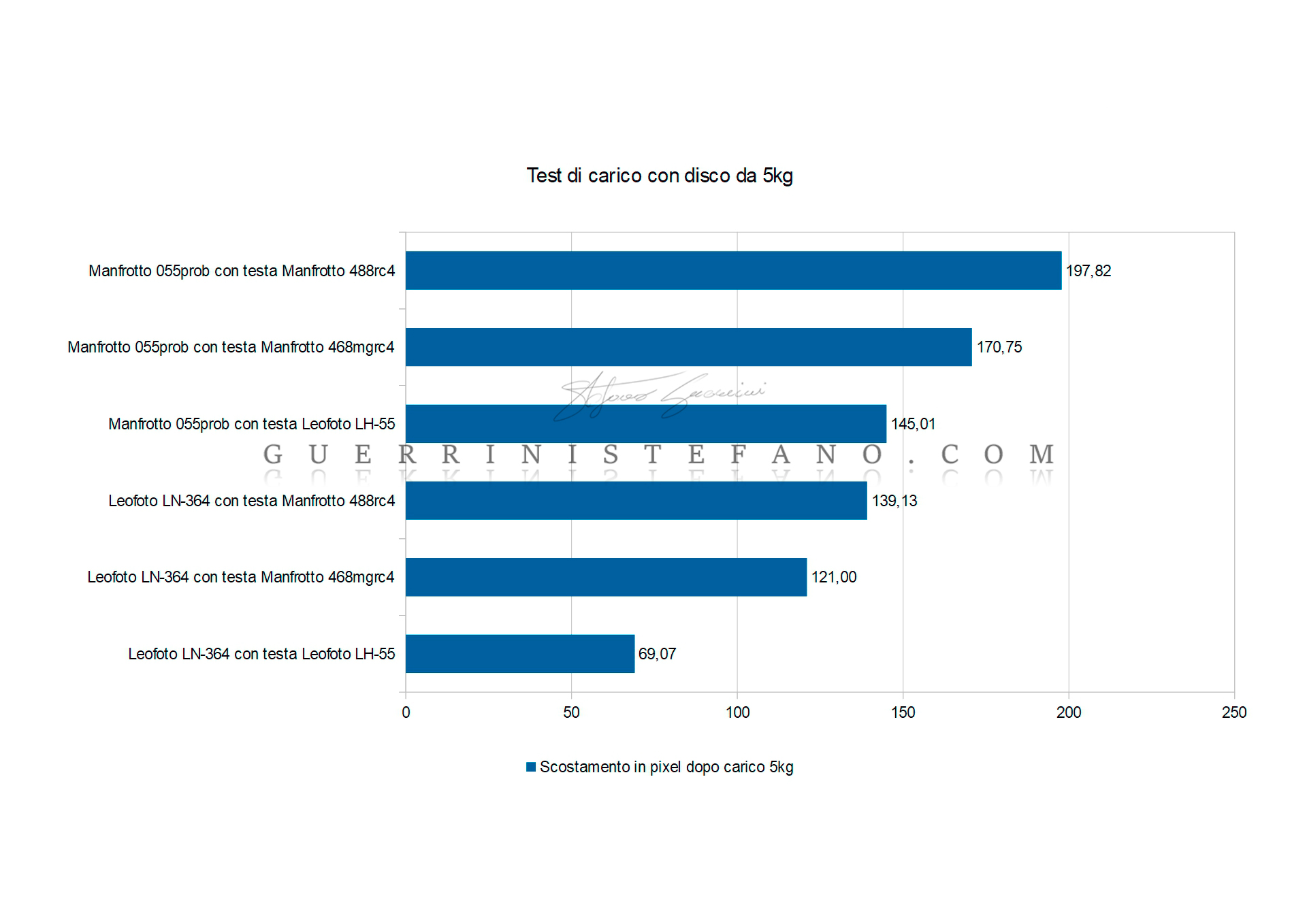 I risultati dei vari test sono riportati nel seguente diagramma comparativo che caso per caso indica lo spostamento in pixel sul piano xy inquadrato:Diagramma-scostamento-dopo-carico-5kg-Manfrotto-Leofoto-by-Guerrini-Stefano