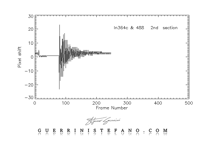 Per fare ciò si è utilizzato un software in grado d’estrapolare da ogni video i singoli frame e d’elaborarli per misurarne lo spostamento in pixel nel tempo di un singolo elemento all’interno della scena inquadrata, ad esempio: una lettera, una linea verticale od orizzontale. Per ogni secondo di video sono state analizzate quindi 50 immagini. Per ogni immagine è stato calcolato lo spostamento in pixel di un elemento a forte contrasto rispetto all’immagine iniziale.