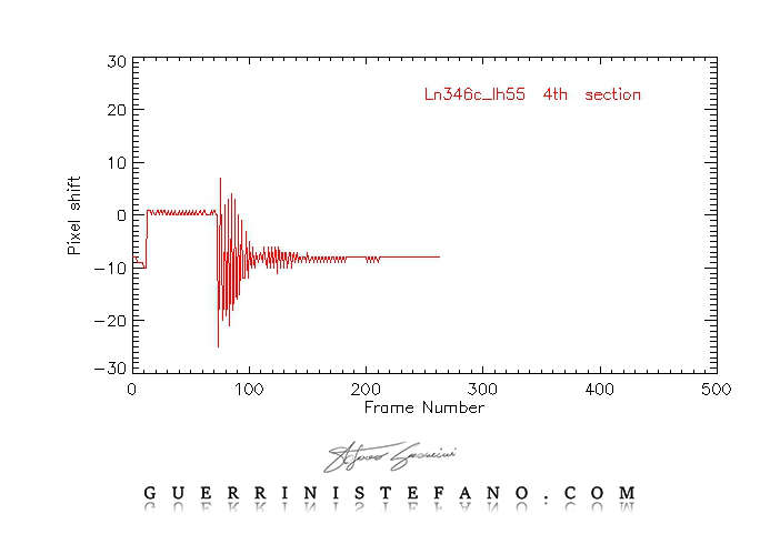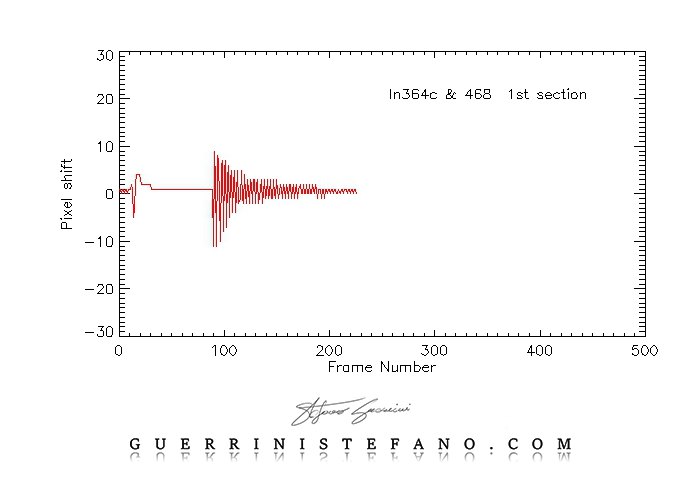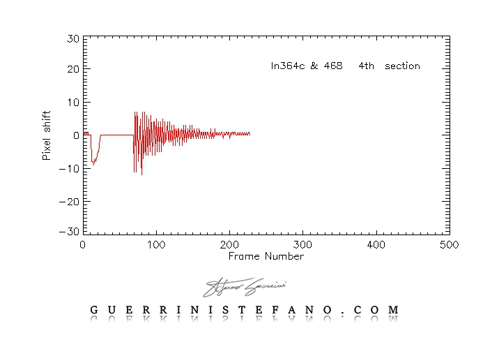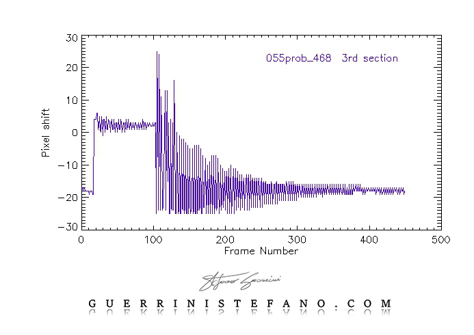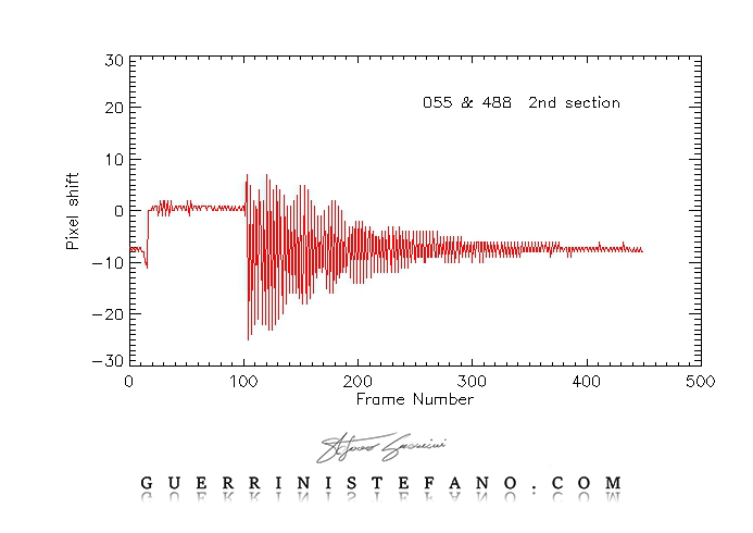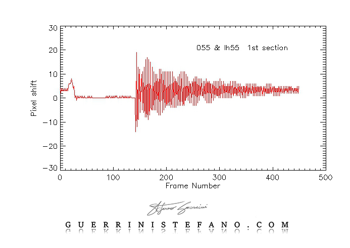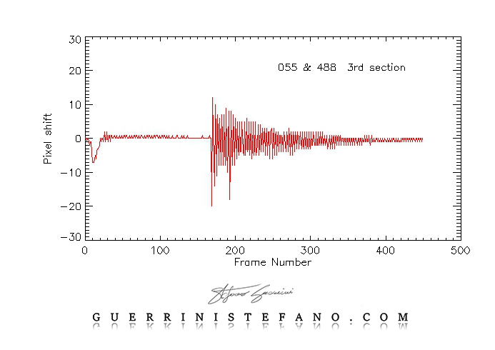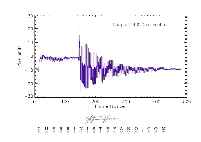 In ogni grafico si ha un andamento iniziale quasi orizzontale con una piccola vibrazione dovuta alla pressione del tasto rec e un successivo breve intervallo in attesa della perturbazione. Ampiezza dell’oscillazione e durata della stessa sono facilmente interpretabili dai grafici. Sull’asse delle ascisse (x) abbiamo i frame numerati in sequenza al posto del tempo t, ma poco importa visto che sappiamo che 50 frame equivalgono ad 1 secondo.