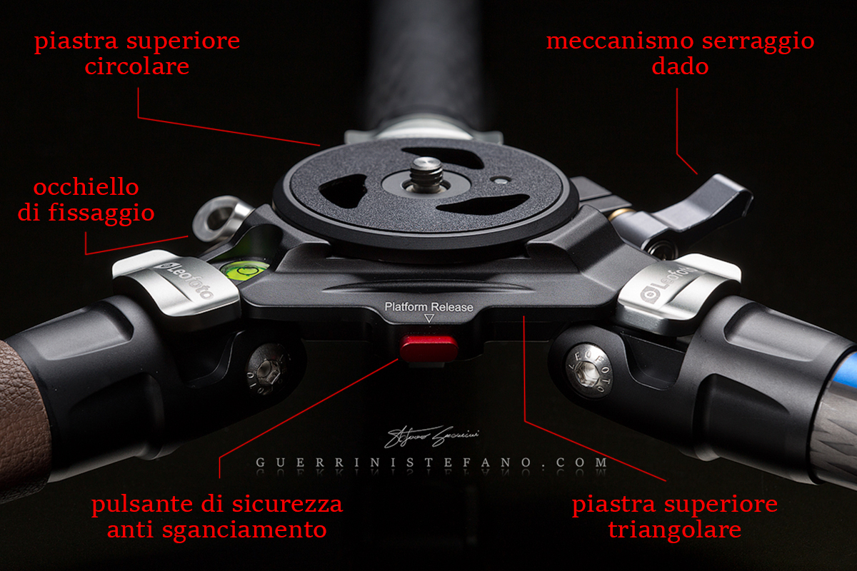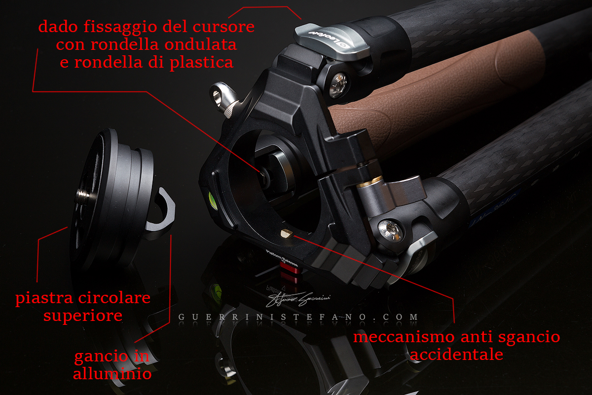 - un pulsante di sicurezza per rilasciare la piastra circolare: nel malaugurato caso che il dado di serraggio sia allentato (ma sinceramente non vedo come possa allentarsi da solo se questo viene chiuso bene) la piastra circolare a cui sarà collegata la testa e la vostra costosa attrezzatura non potrà sganciarsi dal cavalletto. Per sganciarla è infatti necessario agire su un pulsante (anch’esso in alluminio) di colore rosso che rilascia un perno interno alla corona di serraggio superiore e che permette di sfilare il disco circolare. In questo modo anche portando a spalla il cavalletto durante dei brevi spostamenti lasciando attaccata la vostra macchina fotografica con tanto di obiettivo a sbalzo, sarete sicuri che questa non potrà accidentalmente sganciarsi dal cavalletto e cadere a terra!